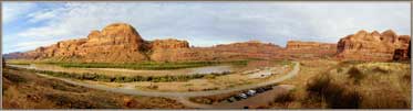 Across Potash Road from the Gold Bar parking lot there is another lot, this one is for the trailhead up to the majestic Corona Arch. This graceful arch is an enormous natural structure, well worth the climb, sitting as it does above a vast natural bowl. Even against a cloudy sky, Corona Arch and the nearby Bowtie Arch are monumental works of Nature.