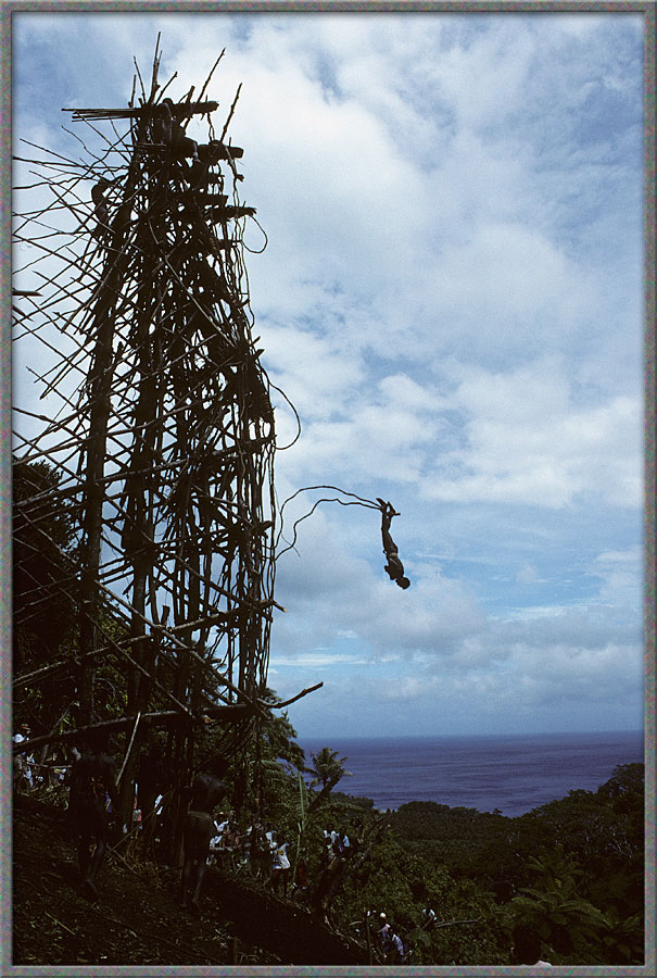 The native village on Pentecost Island offered one of the singular spectacles in all the world, the Land Divers. In the ceremony, natives dove off a 100-foot high tower with only long vines around their ankles to break their fall. The vines would stop their plunge only when their heads brushed the dirt at the base of the tower.